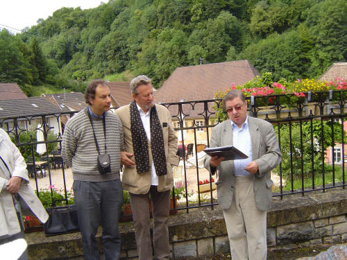 P.H. Wessenberg mit Marc Glotz und André Dubail vor der Silhouette der Stadt Ferrette