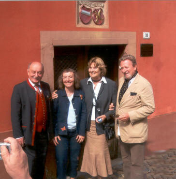 Unter d. Wappen Österreich-Pfirt versammeln sich Vertreter aus Niederösterreich und Elsass: Mme. Wollenschneider mit F. Ressl und Ehepaar Wessenberg