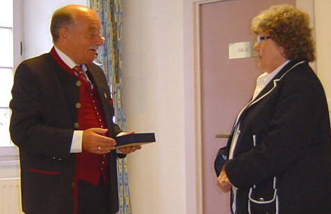 Die erste Referentin Mme. Claerr-Stamm erhält von Bürgermeister Ressl das Wappen der Marktgemeinde Purgstall.