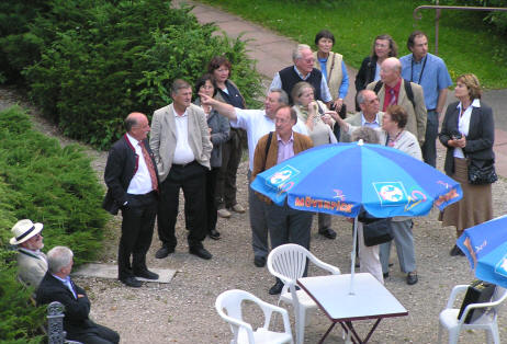 Die Gruppe versammelt sich zur Führung in Lucelle durch Kanonikus Diss, den Leiter des Begegnungszentrums